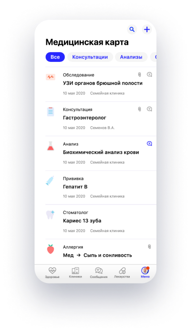 История лечения, заключения, результаты обследований и анализов в одном приложении